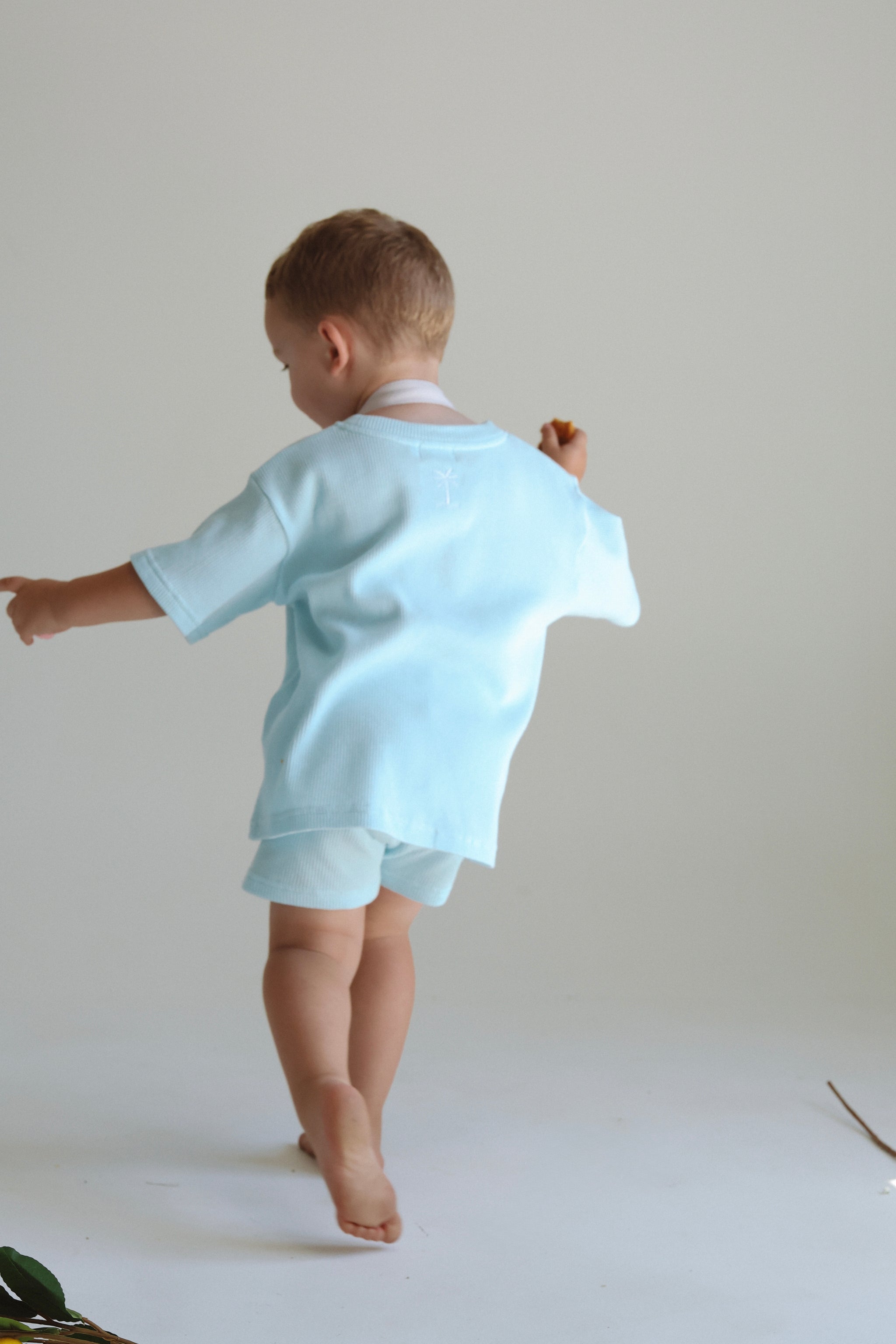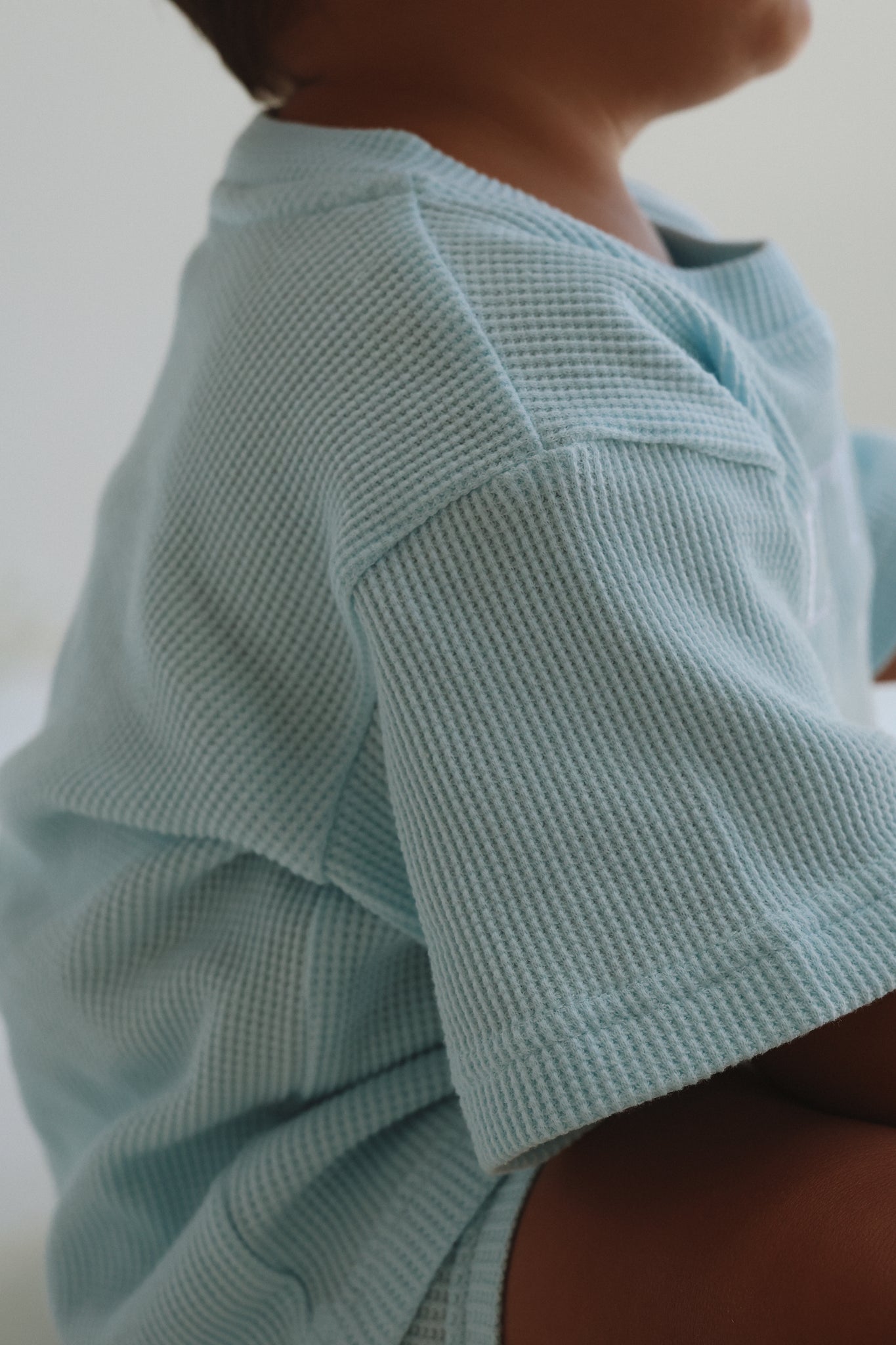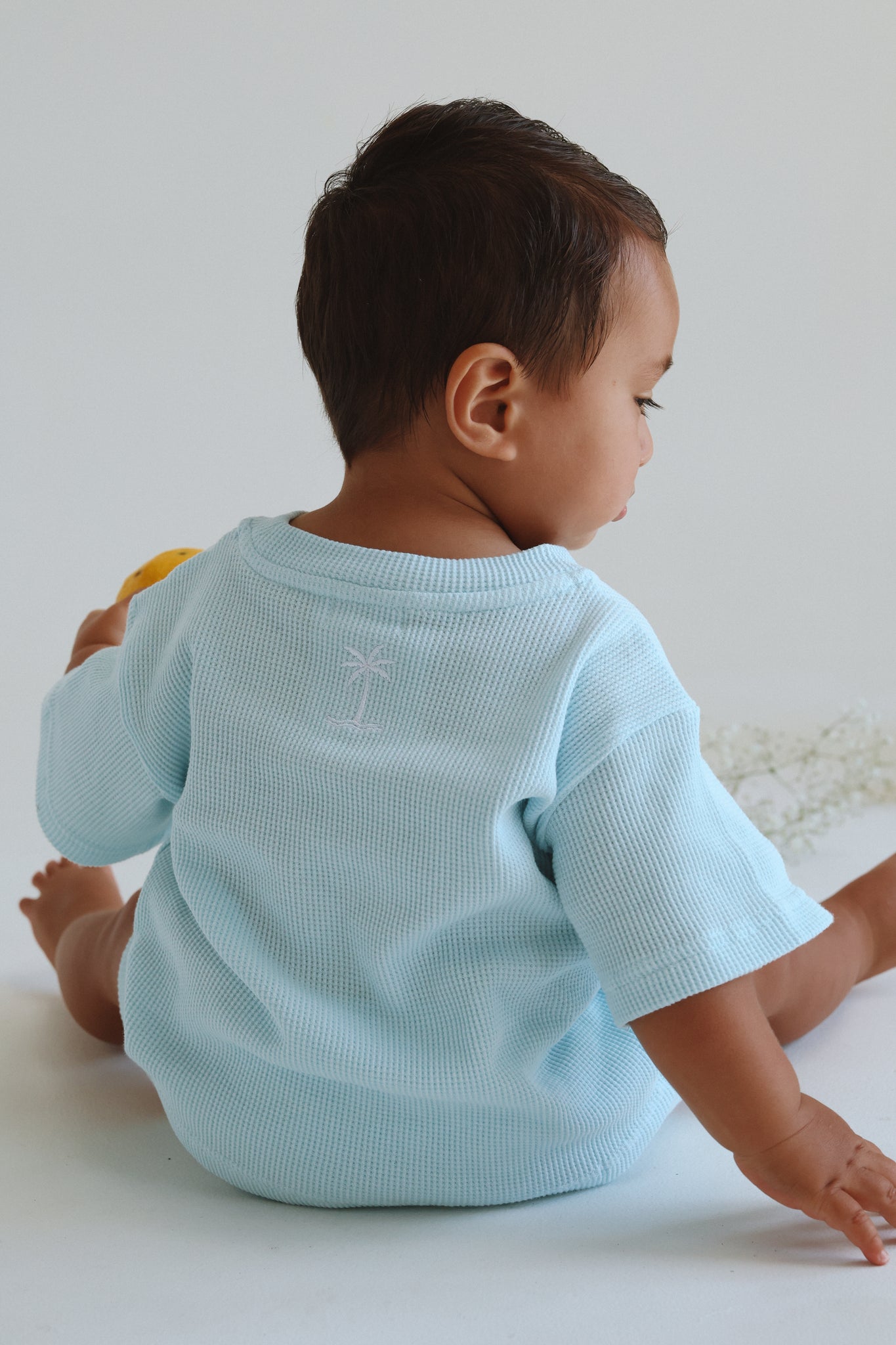 Soft, comfy, and effortlessly stylish, the Sora Oversized Tee is crafted from pastel blue waffle fabric with white embroidery.